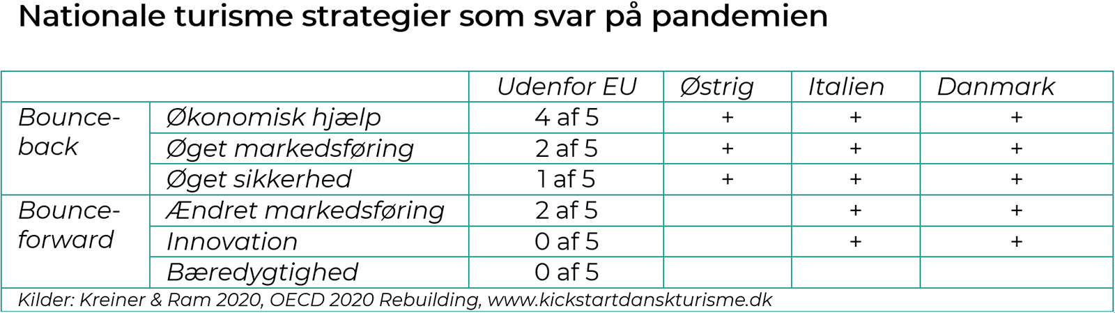 Tre ting er iøjnefaldende, når man sammenligner nationale turismestrategier som svar på pandemien. For det første er den mest udbredte form for støtte helt klart finansielle hjælpepakker, der sigter på at kompensere virksomhederne og/eller ansatte for reduktion i antallet af gæster. For det andet har de tre europæiske lande alene foretaget sig mere for at sikre bounce-back, men de har også været klart mere proaktive med hensyn til bounce-forward initiativer i form af nyorientering af markedsføringen og støtte til innovation og oplevelsesudvikling. Sidst, men ikke mindst, er Danmark blandt de europæiske lande, hvor regeringen har haft en bredspektret strategi. Hvis man skal søge inspiration til yderligere tiltag mht. videreudvikling af turismen i Europa, peger tabellen på, at Italien vil være et oplagt sted at starte - også selvom bæredygtighed heller ikke her bliver prioriteret, når det handler om strategier for turisme efter pandemien.